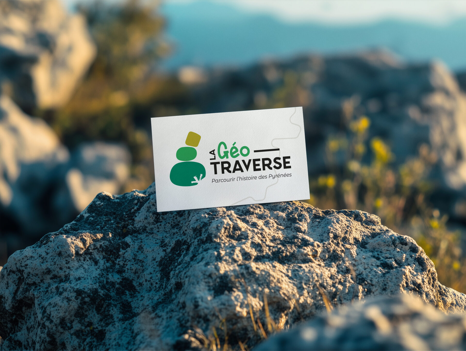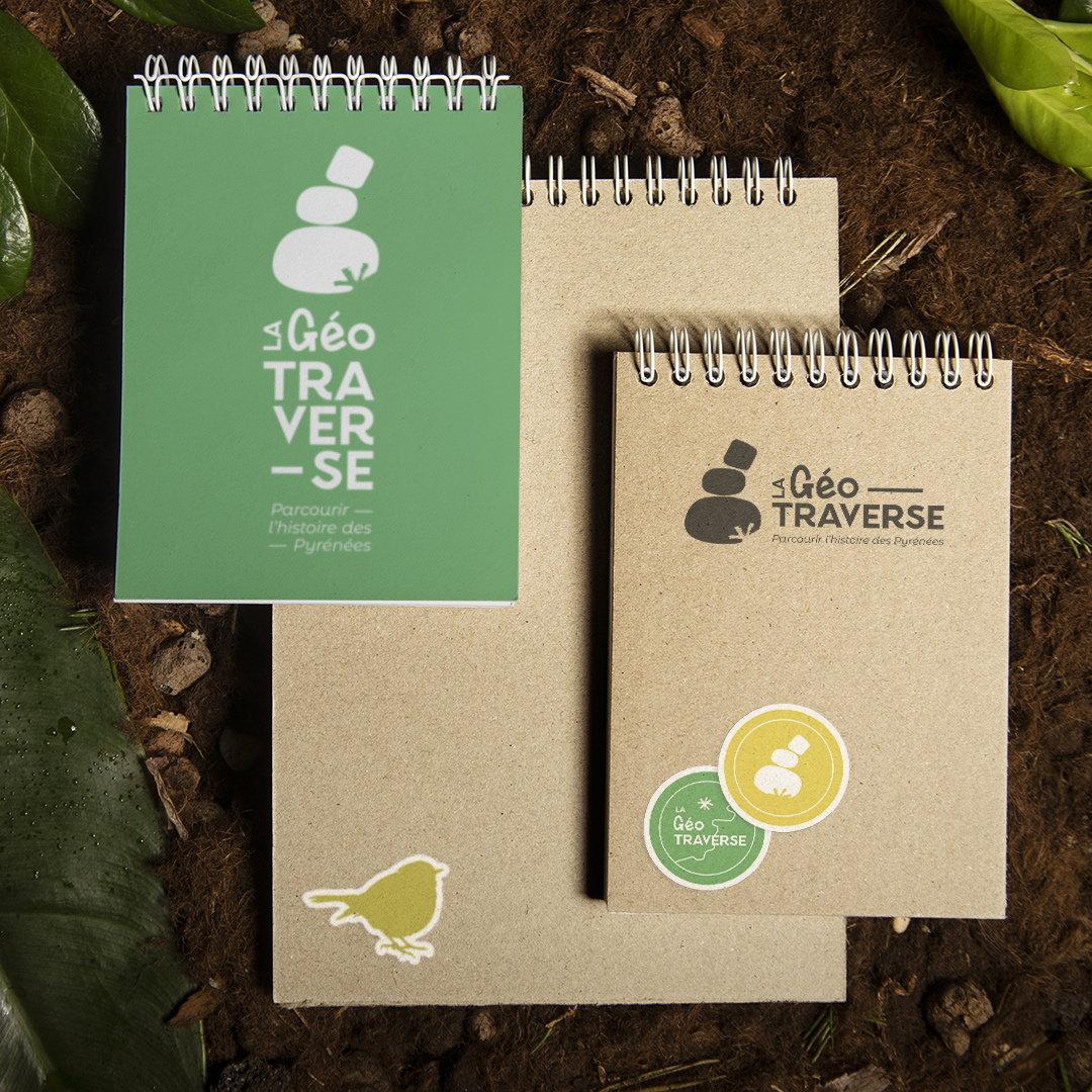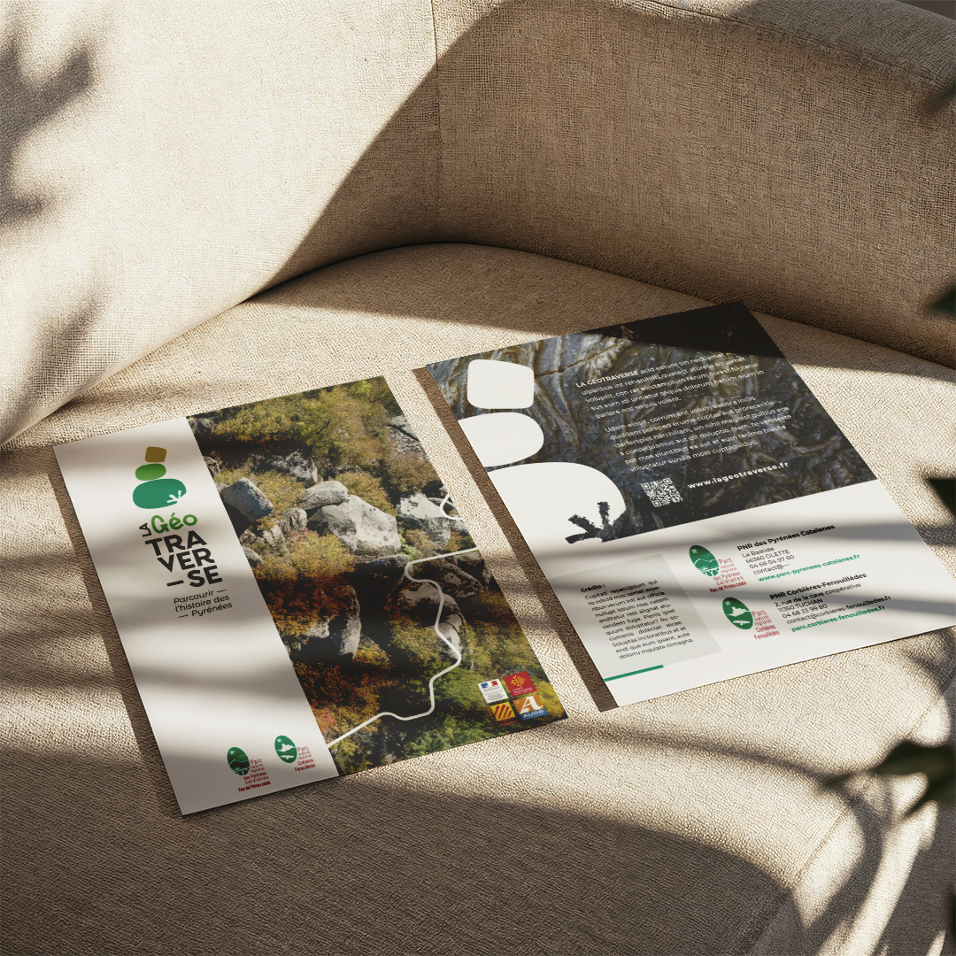 Conception d’une charte graphique pour un itinéraire de découverte à cheval sur deux Parc naturels régionaux (Pyrénées catalanes et Corbières-Fenouillèdes) : cette identité visuelle douce et dynamique invite les promeneurs à venir découvrir le patrimoine géologique local.